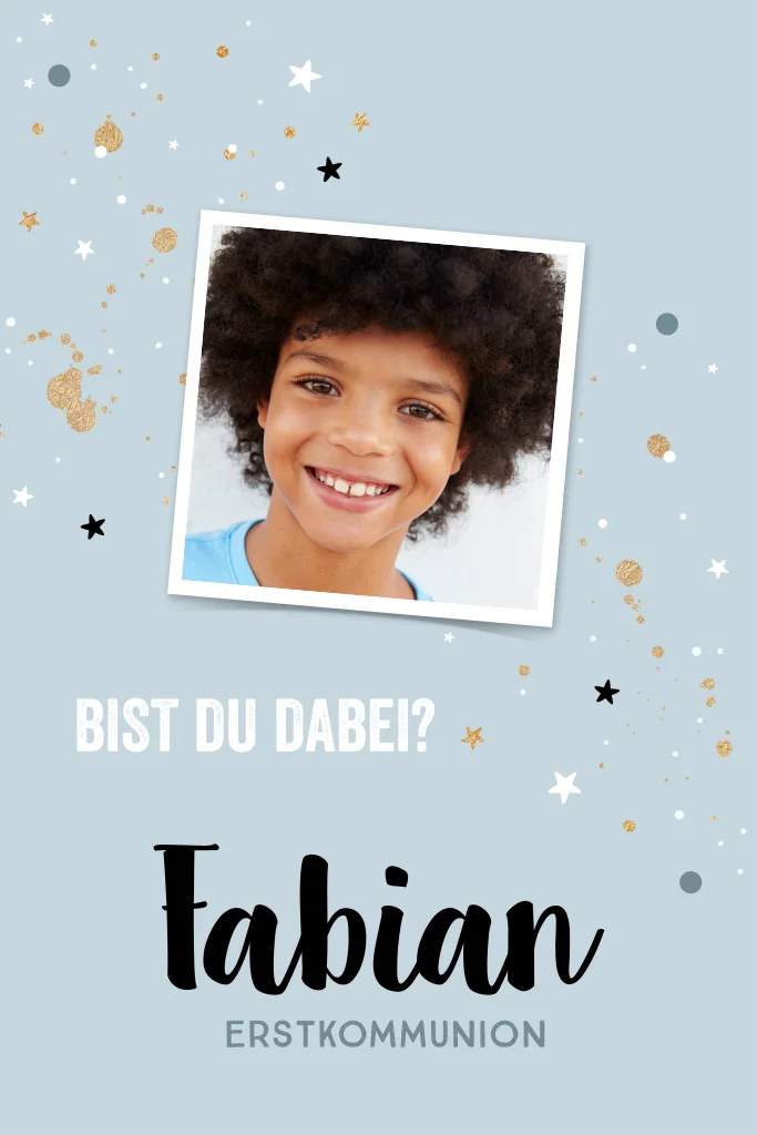 Einladung zur Kommunion mit Foto, Sternen und Goldelementen
