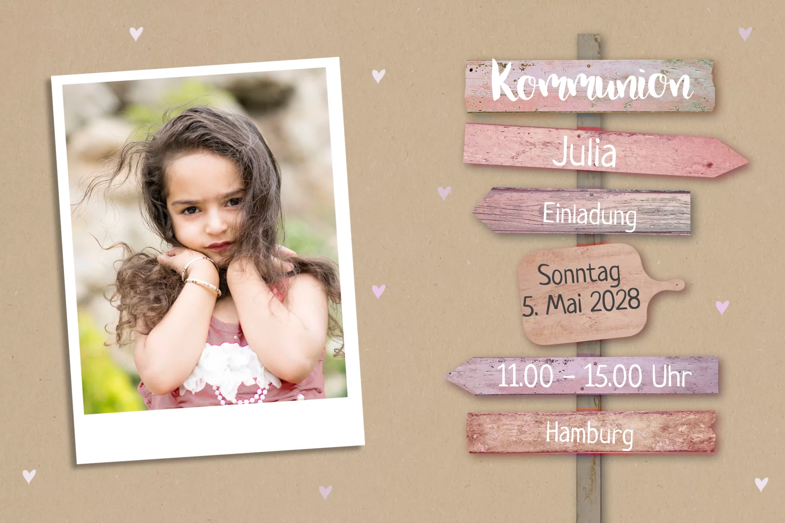 Dies ist wirklich eine moderne Mädchenkommunionkarte! Mit trendigem Kraftpapier mit weißem Herzmuster und festlichem Strandpfosten. Platziere dein eigenes Foto im Polaroid, damit jeder sofort weiß, von wem die Einladung kommt!Auf der Suche nach mehr Inspiration? Sieh dir hier unsere Einladungskarten zur Kommunion an.