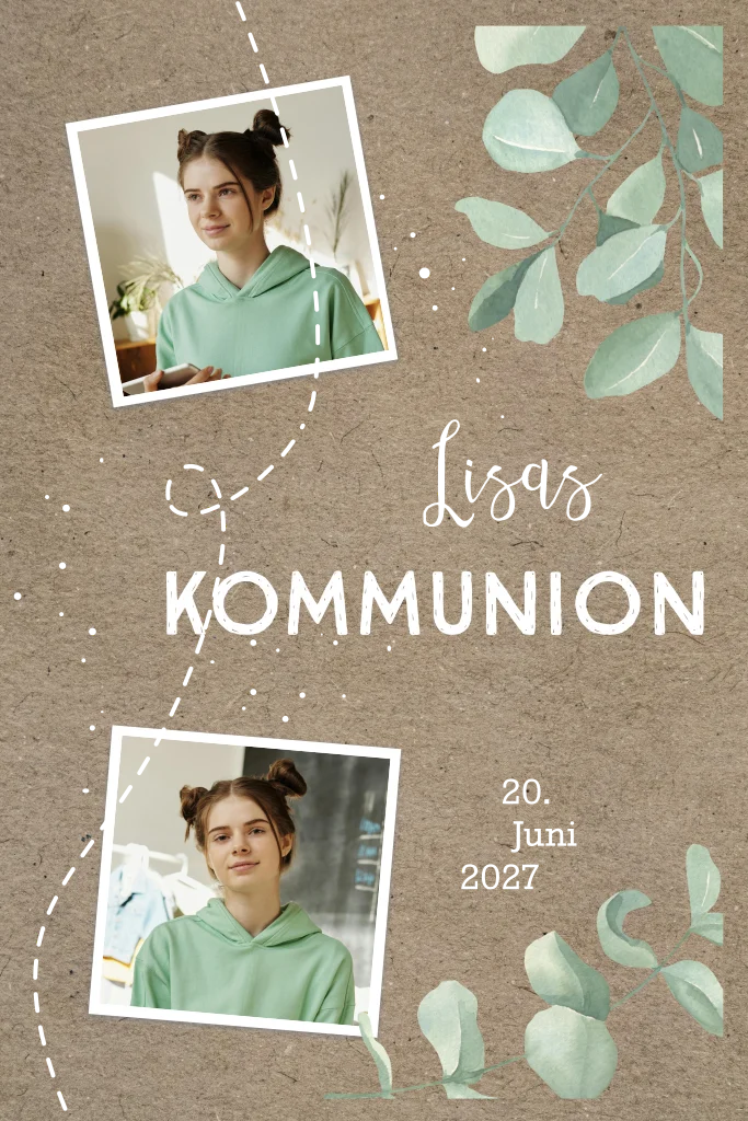 Einladung zur Kommunion im Kraft-Look mit Goldfolie und Fotos
