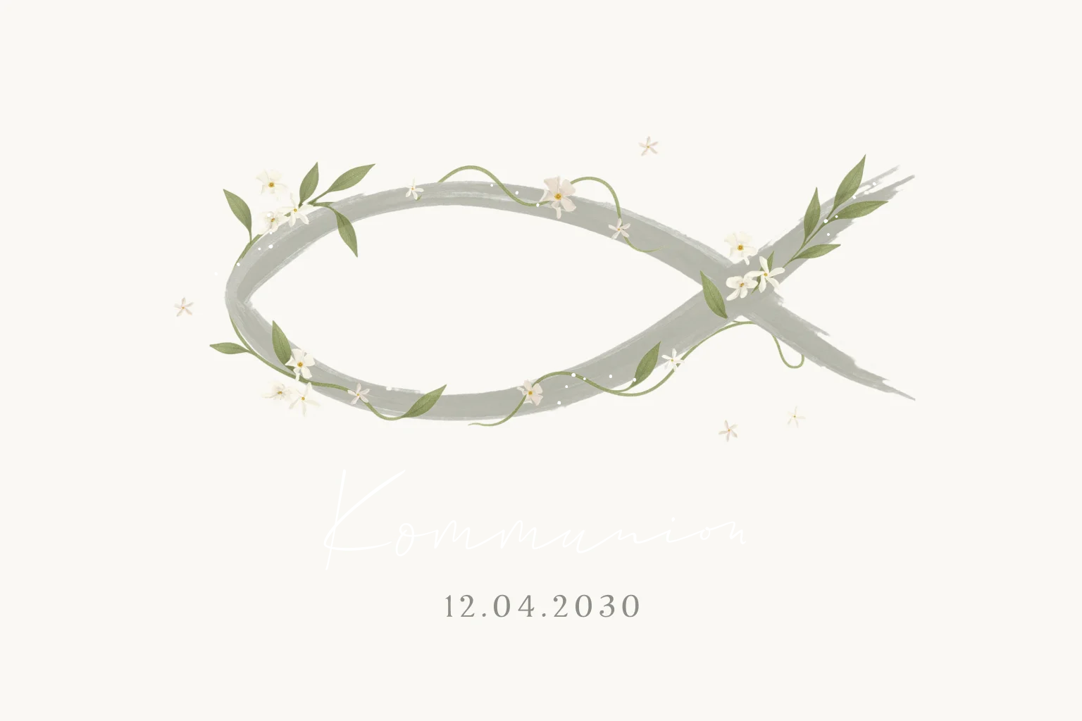 Einladung zur Kommunion mit Aquarell, Ichthys-Fisch und Blumen