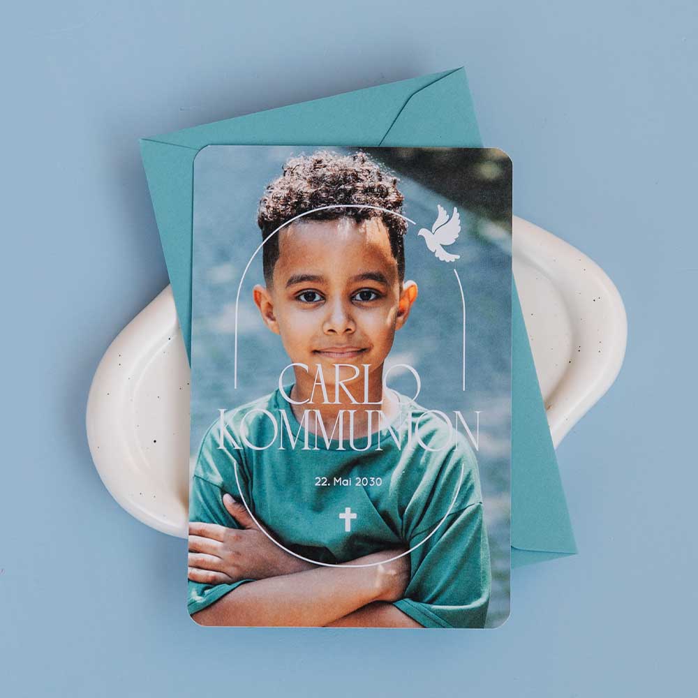 Einladung zur Kommunion für Jungen mit Foto und Taube