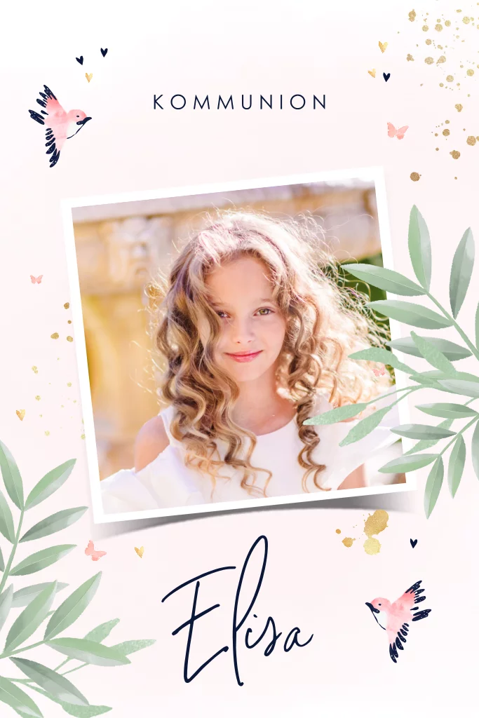 Fröhliche Einladungskarte zur Kommunion in rosa mit Foto und Vögeln