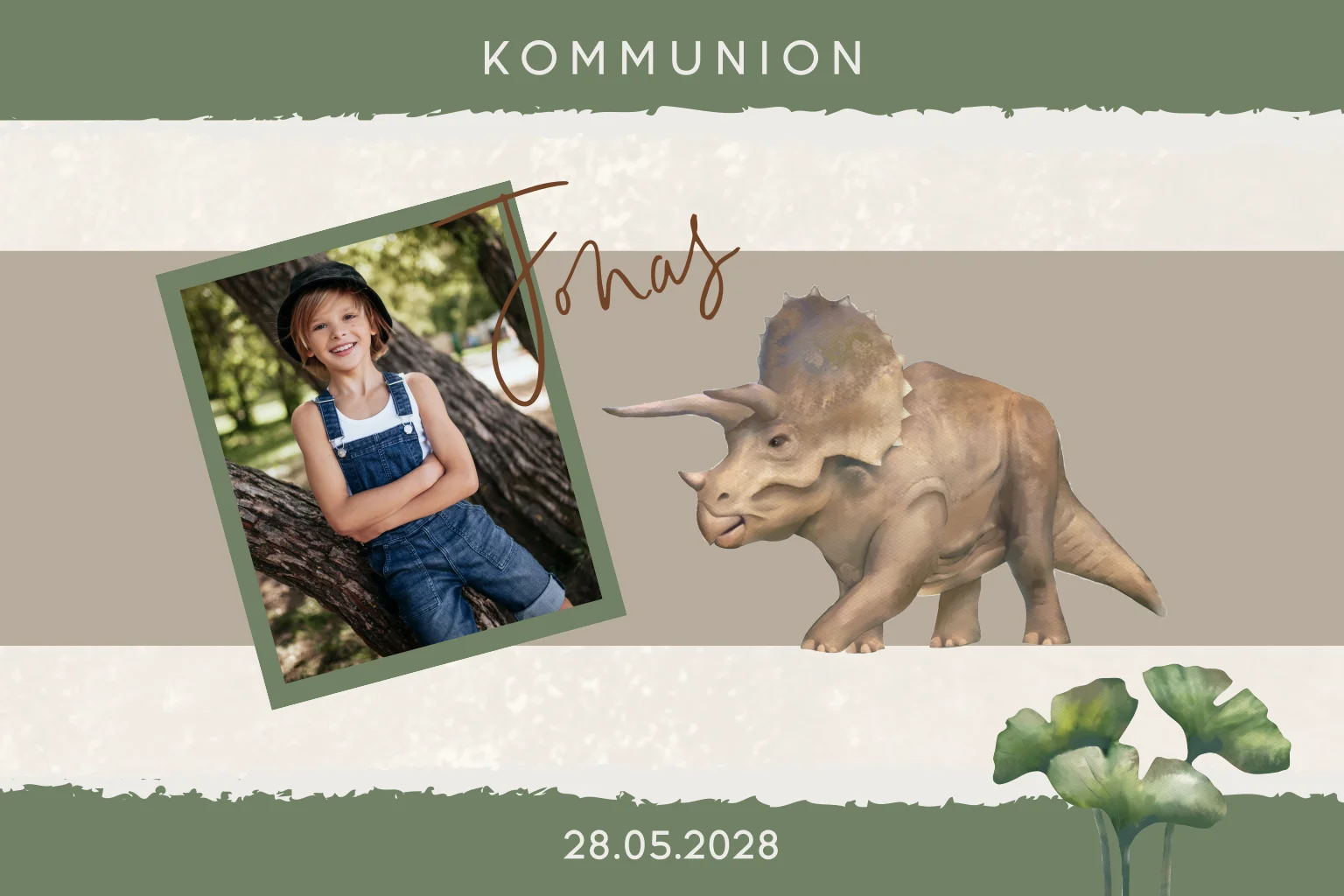 Grün-braun gestreifte Einladung zur Kommunion mit Foto und Dino