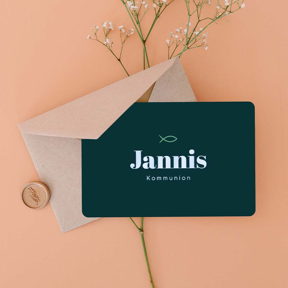 Grüne Einladung zur Kommunion mit Ichthys Fisch