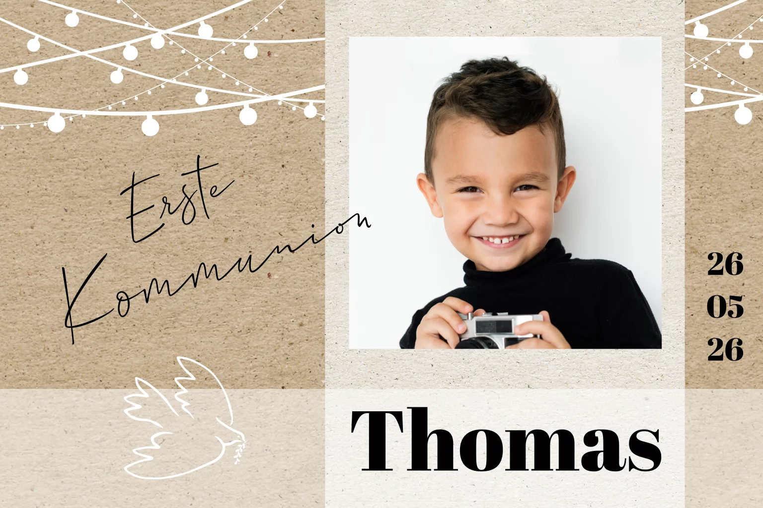 Die Kommunion ist ein christliches Ereignis, bei dem das Kind ein vollständiges Mitglied der katholischen Kirche wird und die für die Familie mindestens so wichtig ist wie Taufe oder Hochzeit. Ein guter Grund, ein großes Fest zu feiern und Familie, Verwandte und Nachbarn einzuladen. Diese fröhliche Einladungskarte für deine Kommunionsfeier kannst du mit deinem eigenen Foto personalisieren.