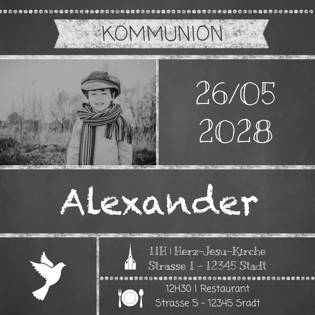 Trendige Einladung für Deine Erstkommunion mit schwarzer Tafel als Hintergrund, Banner und Foto. Ändere den Text, und platziere Dein Foto, um die Karte zu vervollständigen!Bei quadratische Karten fällt ggf. ein anderes Briefporto an. Alle Infos findest du auf der Website der Deutschen Post. Zu diesem Format erhältst du Umschläge in der Größe 14x12,5 cm. Format ändern ist möglich.