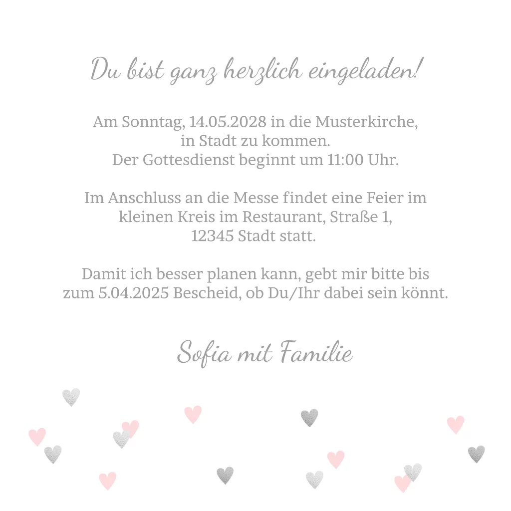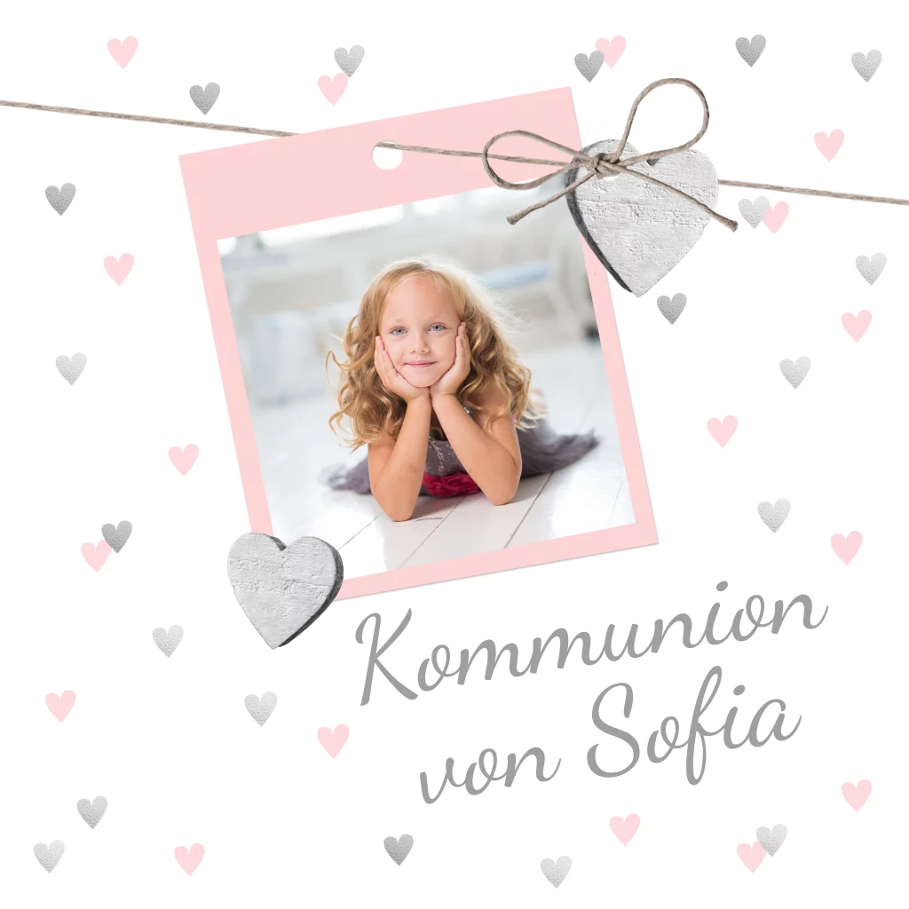 Liebe Kommunionskarte für Mädchen mit Herzchen in rosa und grau. Das Foto und der Text können ganz einfach im Editor bearbeitet werden.