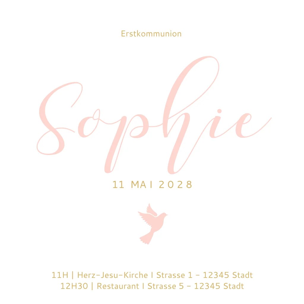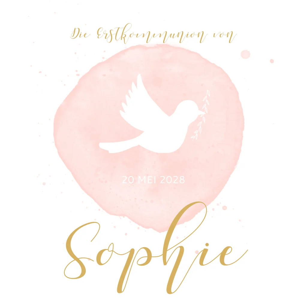 Schöne Kommunionskarte für ein Mädchen mit einem Vogel und Zweigen. Der Aquarellhintergrund mit den Farbtupfern verleiht dieser Karte einen trendigen Look. Bearbeiten Sie den Text einfach in unserem Online-Editor.