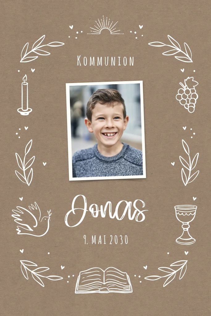 Kraftpapier-Einladung zur Kommunion mit Linienzeichnungen und Foto
