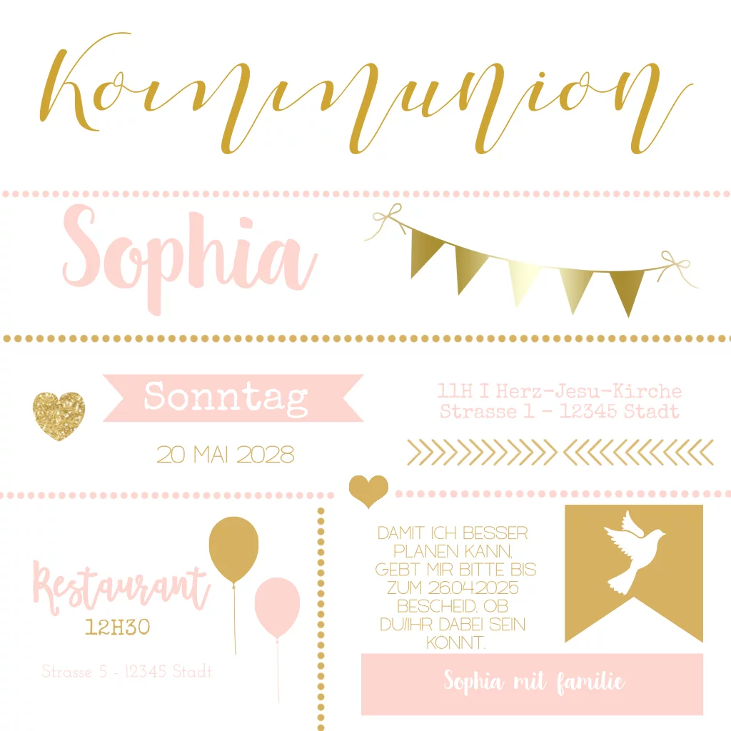 Feierliche Erstkommunionskarte für Ihre Tochter mit festlichen Elementen wie goldenen Girlanden, Herzen, Ballons und rosa Schriftzügen.