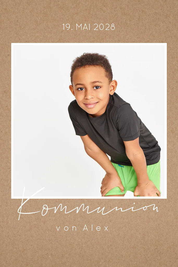 Schlichte Einladung zur Kommunion im Kraftlook mit drei Fotos
