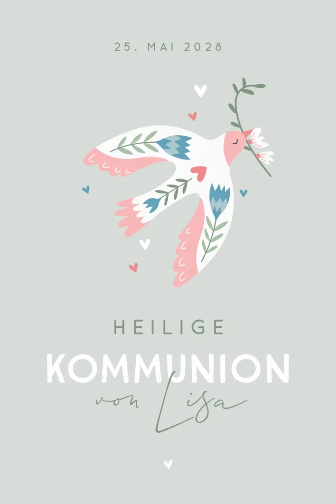 Schlichte Einladungskarte zur Kommunionsfeier mit bunter Taube