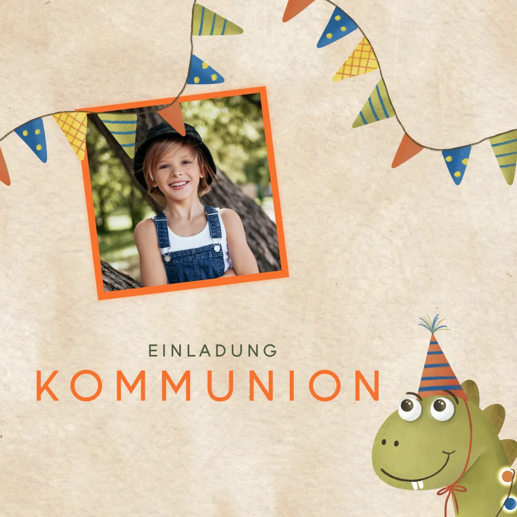 Verspielte Einladung zur Kommunion mit Dino und bunter Girlande