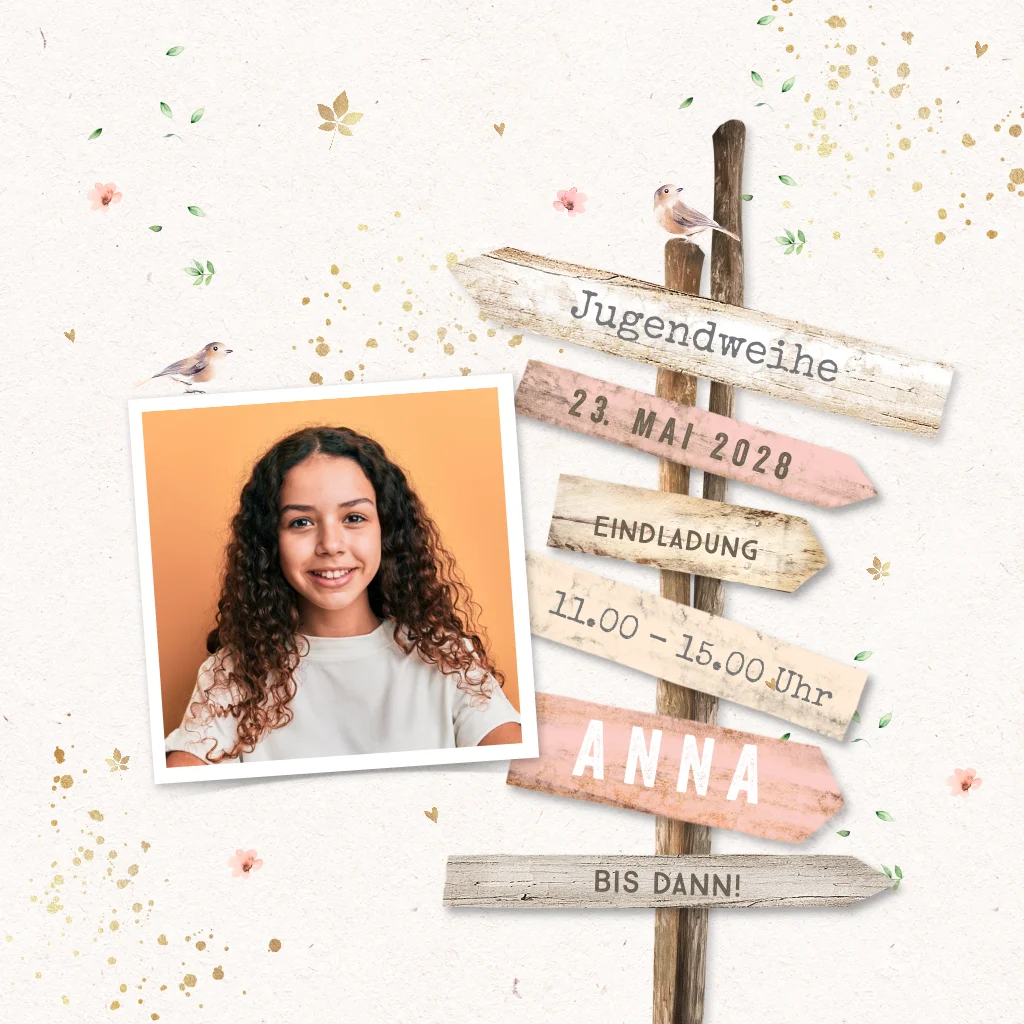 Einladung zur Jugendweihe mit Wegweiser und Foto.Bei quadratische Karten fällt ggf. ein anderes Briefporto an. Alle Infos findest du auf der Website der Deutschen Post. Zu diesem Format erhältst du Umschläge in der Größe 14x12,5 cm. Format ändern ist möglich.