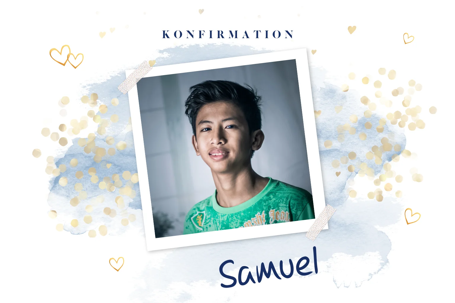Einladung zur Konfirmation mit Foto und blauen Aquarell Wolken, goldenen Punkten und Herzen.