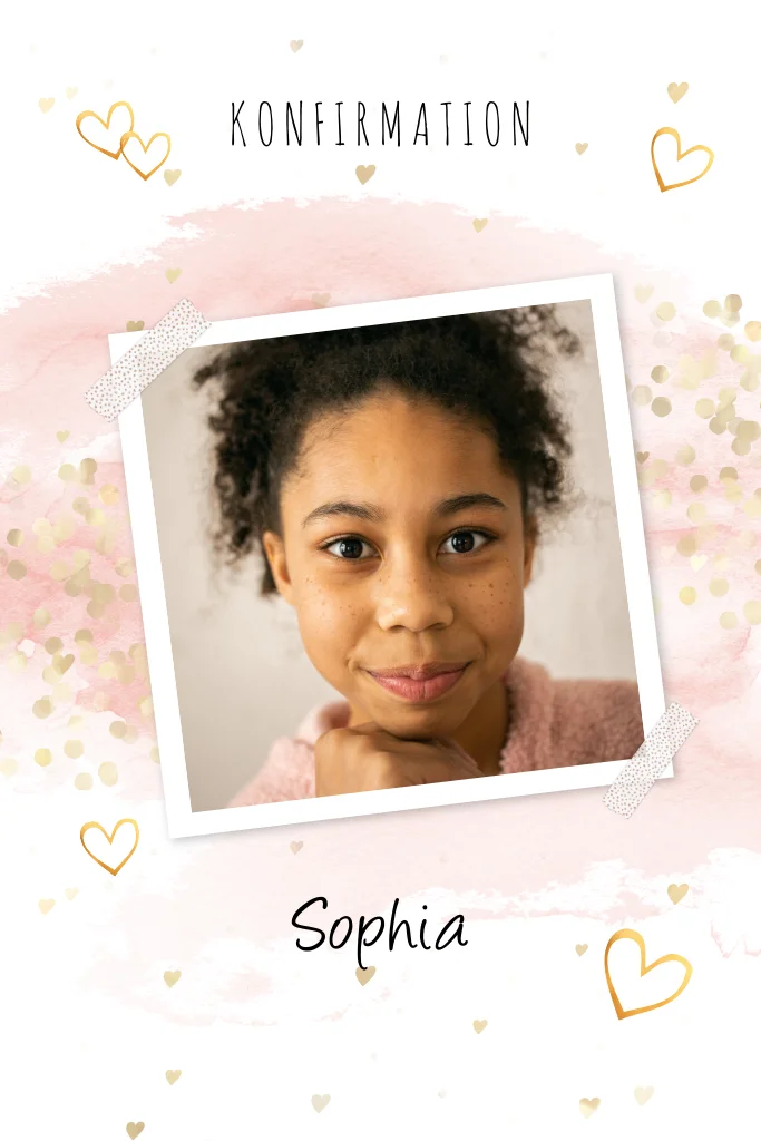 Einladung zur Konfirmation mit Foto und rosa Aquarell Hintergrund