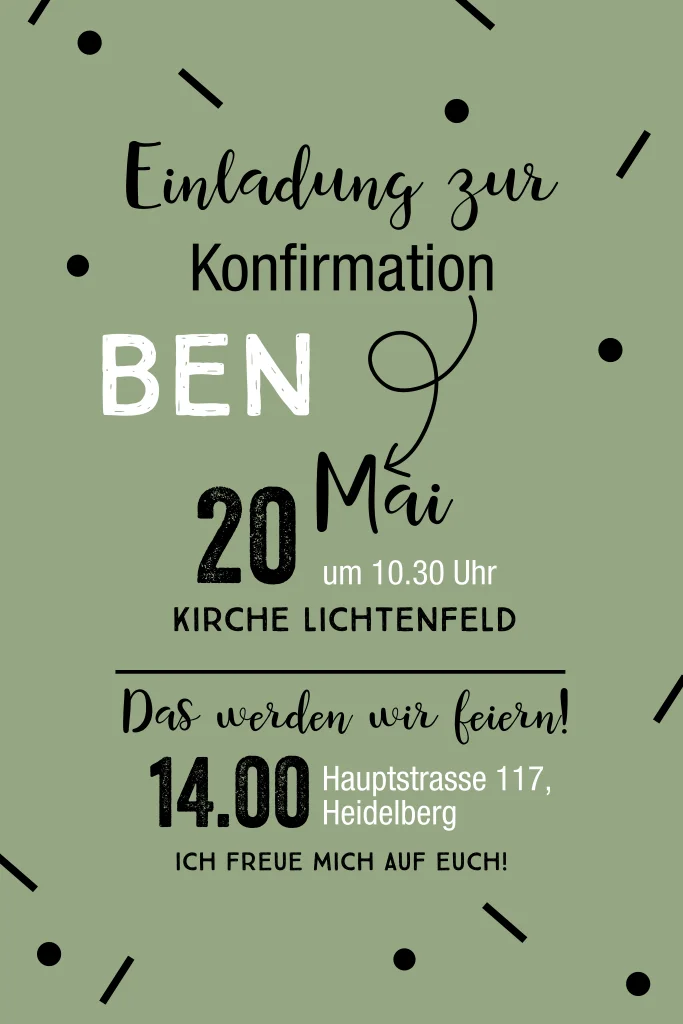 Das Design der von dir gewählten Karte wurde automatisch in andere Formate umgestellt. Wähle einfach deinen Wunschformat aus und platziere alle Texte und Elemente an der richtigen Stelle im Editor. Du hast Fragen oder dein Favorit steht nicht zur Auswahl? Dann kontaktiere uns bitte und wir werden uns gemeinsam darum kümmern!