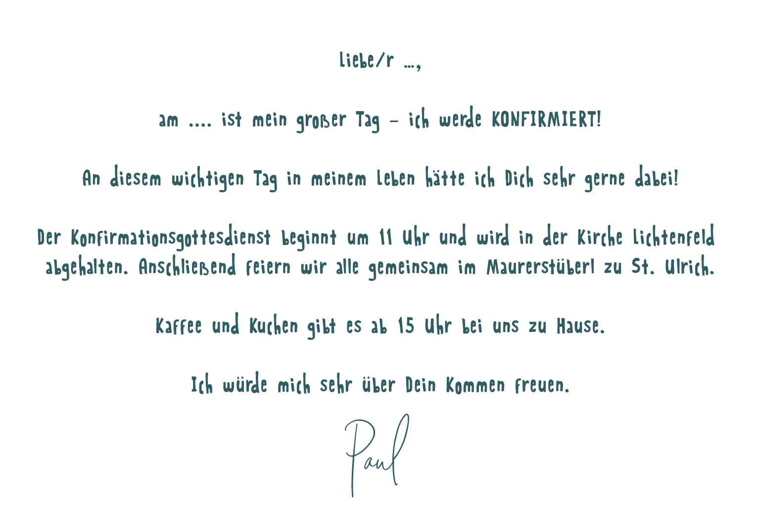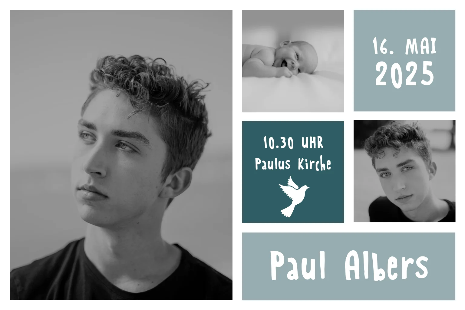 Trendige Einladungskarte zur Konfirmation, bei der Sie 3 Fotos in den Rahmen einfügen können. Mit mintgrünen Formen, ausgefallener Typografie und der Illustration einer Taube.Melde dich für unseren Newsletter an und entdecke exklusive Angebote, kreative Inspirationen und spannende Neuigkeiten aus unserer Produktwelt. Als Dankeschön erhältst du 5 € Rabatt auf deine nächste Bestellung.