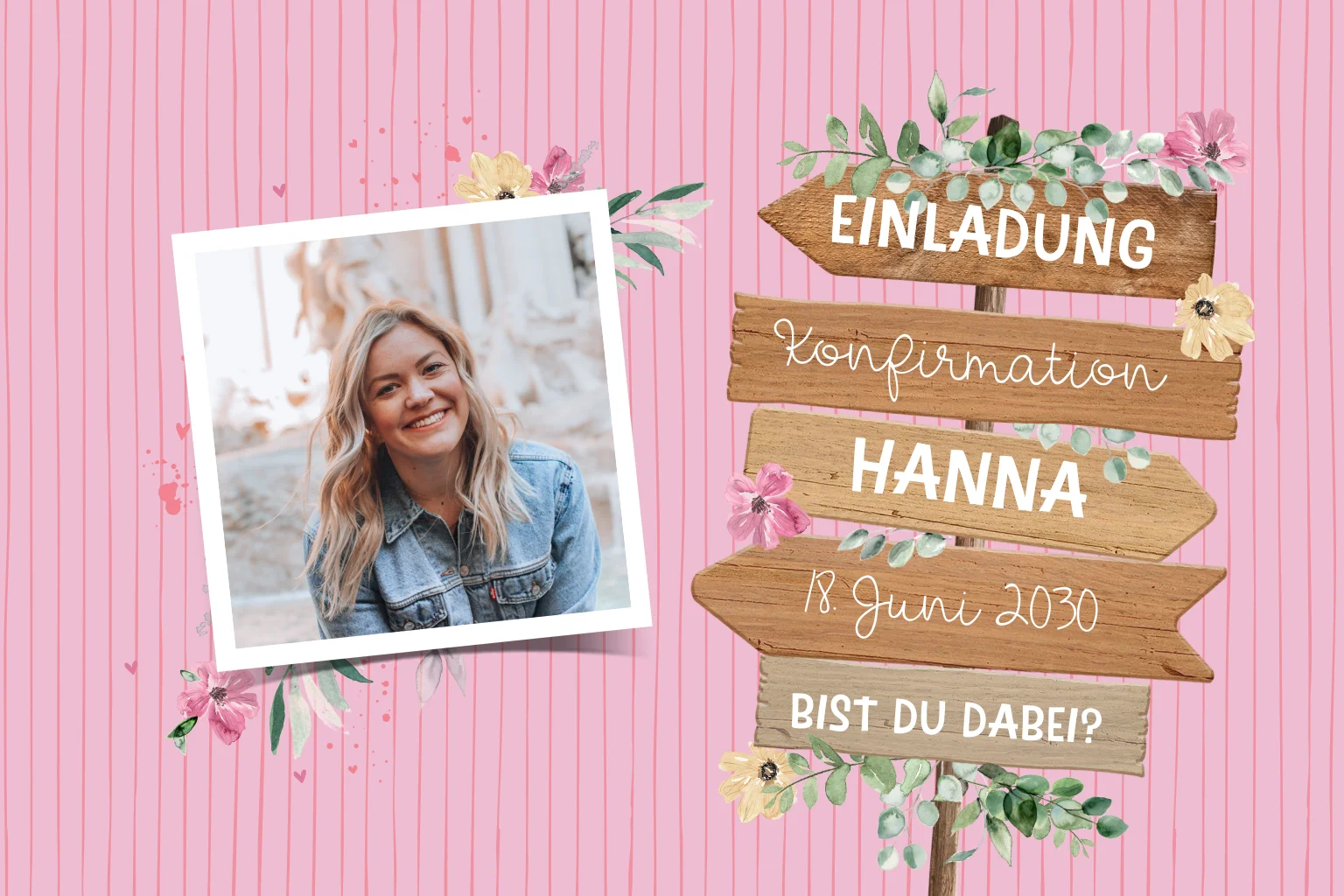Einladung zur Konfirmation in Rosa mit Wegweiser und Foto