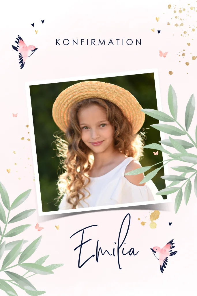 Fröhliche Einladungskarte zur Konfirmation in rosa mit Foto, Vögeln und Herzen.