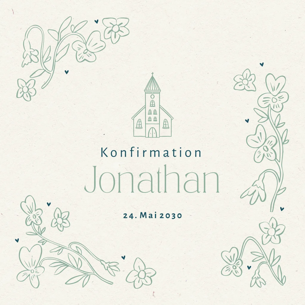 Grüne Einladung zur Konfirmation mit Linienzeichnungen von Blumen
