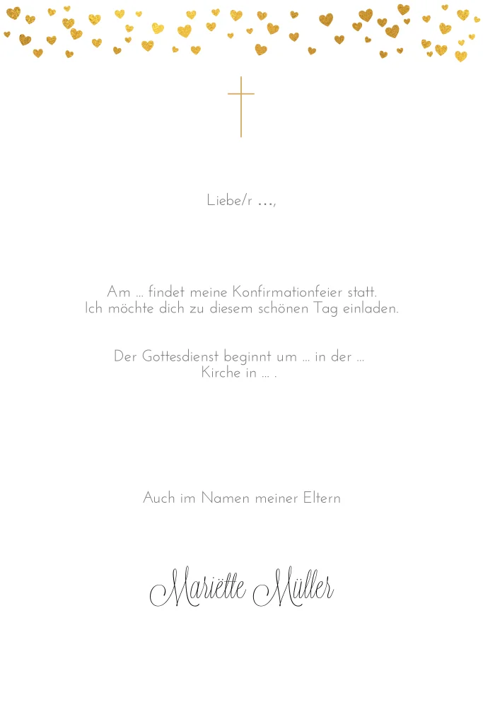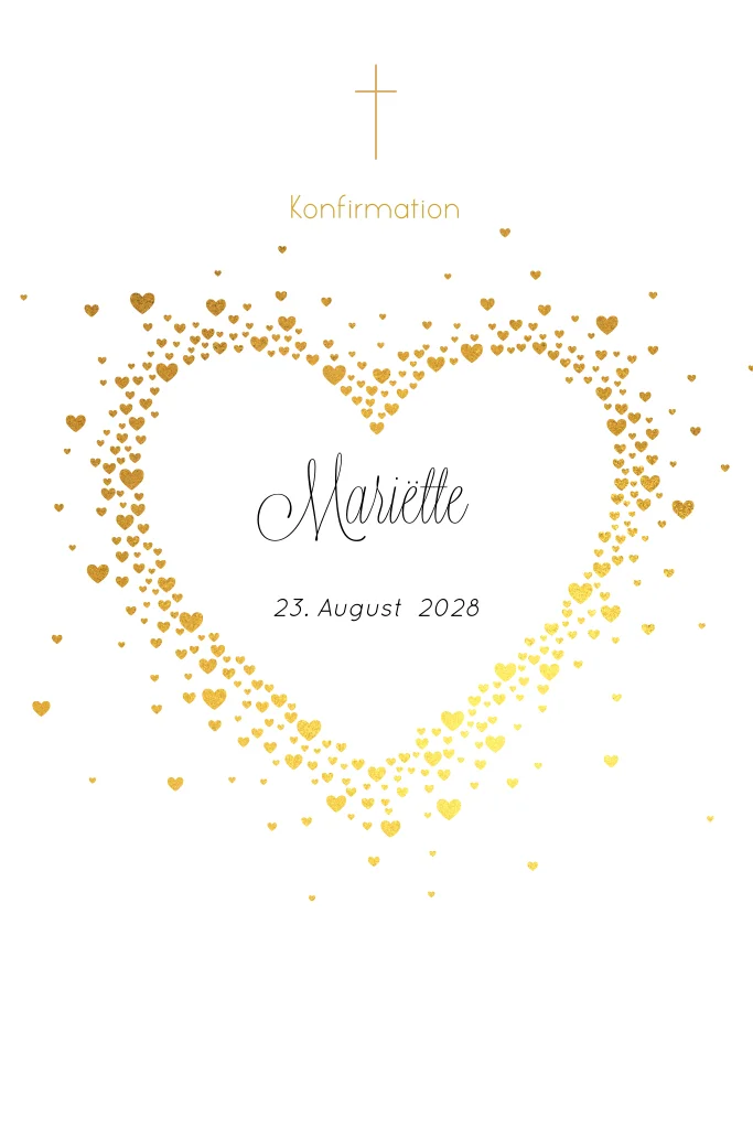 Superschöne Kommunions- oder Konfirmationskarte mit einem Herz aus Herzen in Gold-Optik. Eine schöne Einladung für deine Kommunion oder Konfirmation, die du selbst gestalten kannst.Melde dich für unseren Newsletter an und entdecke exklusive Angebote, kreative Inspirationen und spannende Neuigkeiten aus unserer Produktwelt. Als Dankeschön erhältst du 5 € Rabatt auf deine nächste Bestellung.