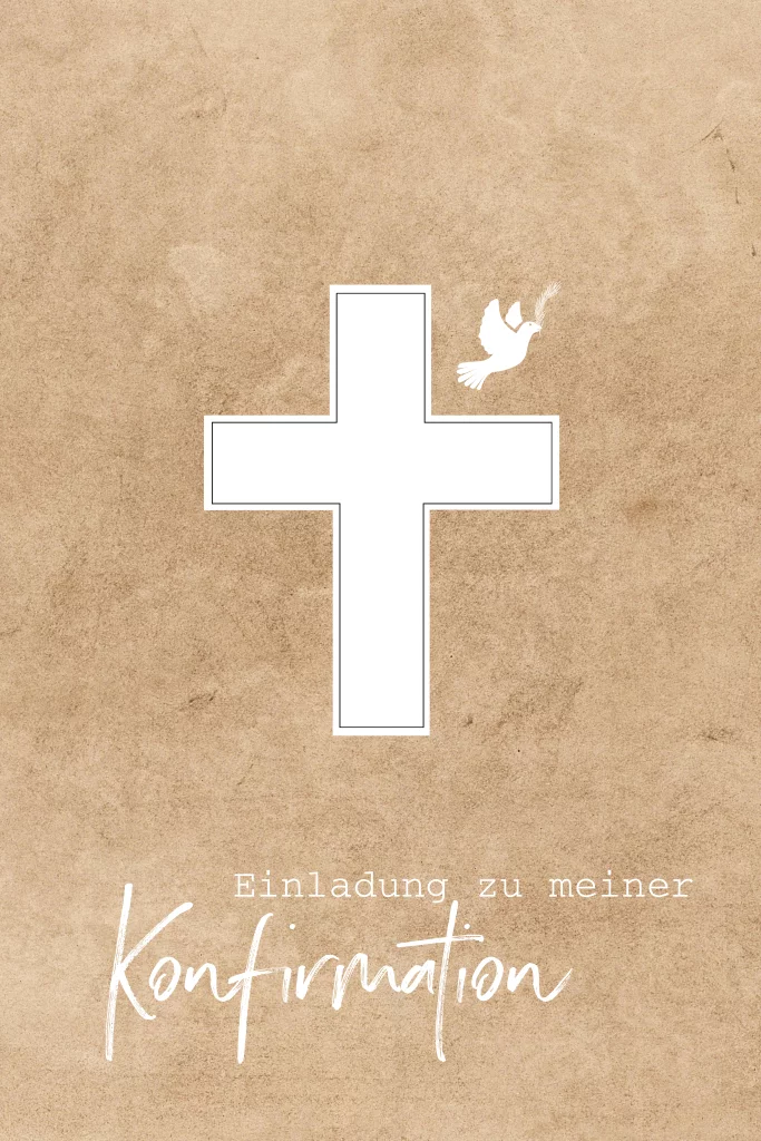Klassische Konfirmationskarte mit weißem Kreuz und Taube. Der Kraftpapier-Look-Hintergrund verleiht dieser Karte einen modernen Stil. Ideal passend zur Konfirmation Ihres Kindes.