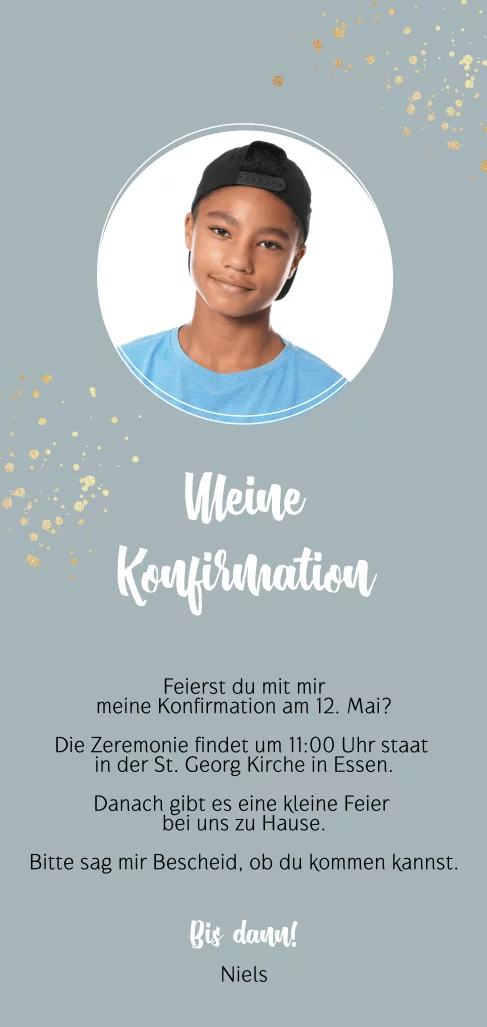 Konfirmationseinladung mit Foto in Blau mit Goldelementen
