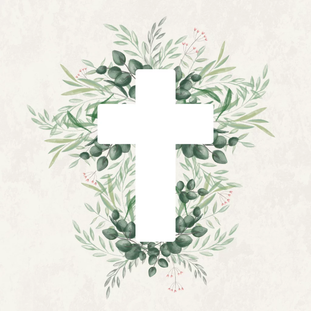 Konfirmationseinladung mit gemalten Blättern und Kreuz
