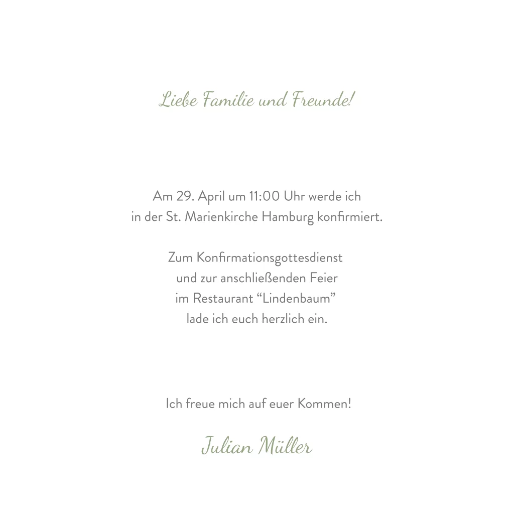 Einladungen zur Konfirmation sind mit deiner einzigartigen Gestaltung schöne Erinnerungen, die deine Gäste gern aufbewahren. Mache Eindruck mit dieser hübschen Konfirmationseinladung mit gemalten Blättern und Blumen und edelem Goldfoliendruck. Auf der Innenseite kann man ein eigenes Foto platzieren und die Texte individuell gestalten.