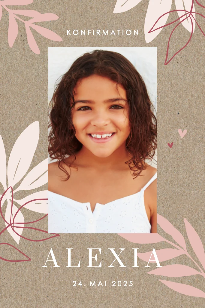 Schöne Einladung zur Konfirmation Ihrer Tochter! Auf der Vorderseite ist Platz für ein Foto. Die rosa Blätter auf dem Kraft-Look vervollständigen diese Karte.