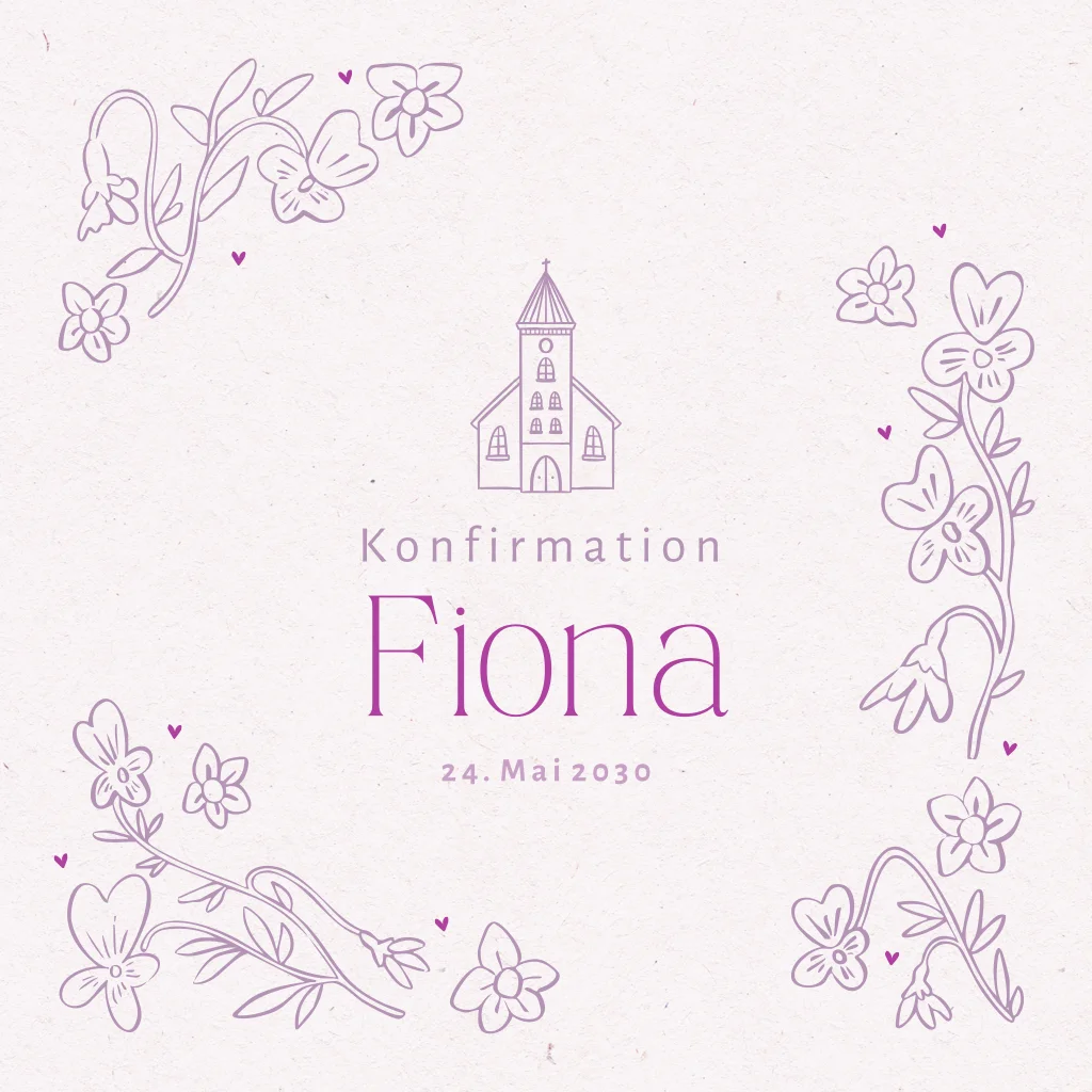 Lila Einladung zur Konfirmation mit Linienzeichnungen von Blumen
