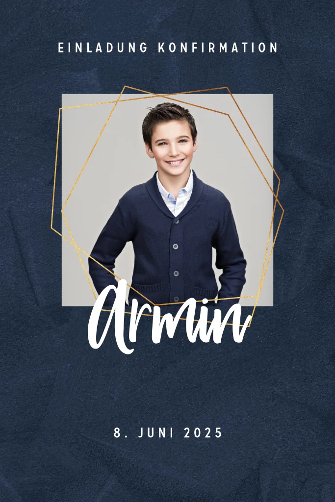 Moderne Einladungskarte zur Konfirmation mit nachtblauem Hintergrund und goldenem Rahmen.