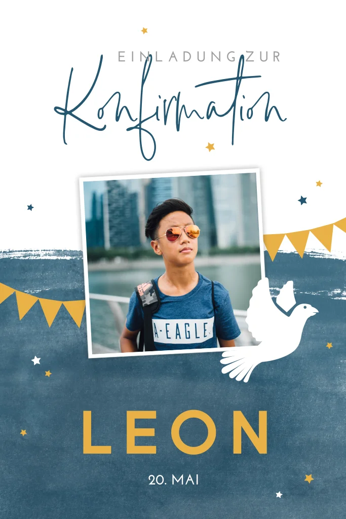 Moderne Einladung im blauen Aquarell-Look. Diese Karte zeichnet sich durch die Illustration einer weißen Taube und ockergelbe Girlanden auf blauem Hintergrund aus. Im Editor können Sie das Foto und den Text nach Ihren Vorstellungen anpassen.