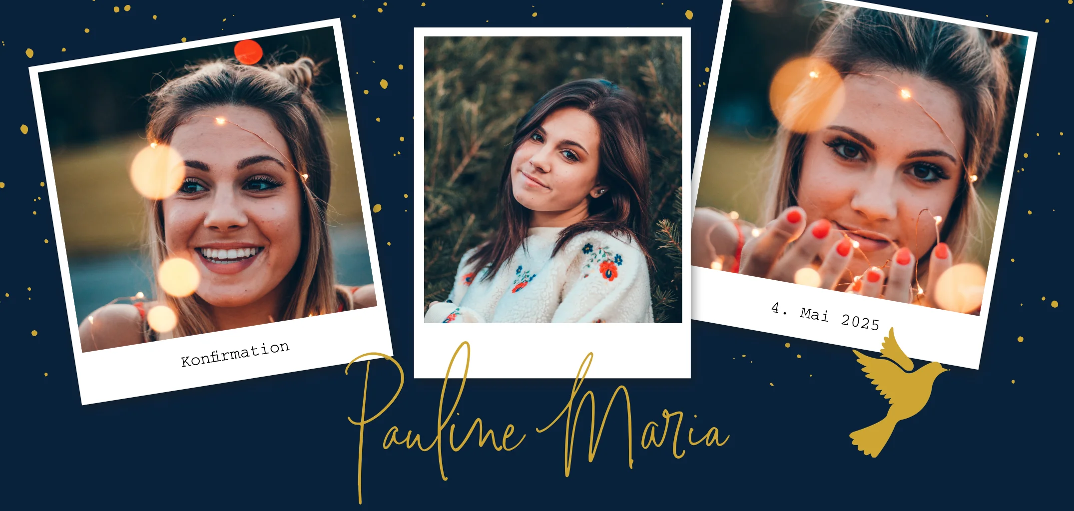 Elegante Einladung zur Konfirmation mit Fotos und goldenen Elementen