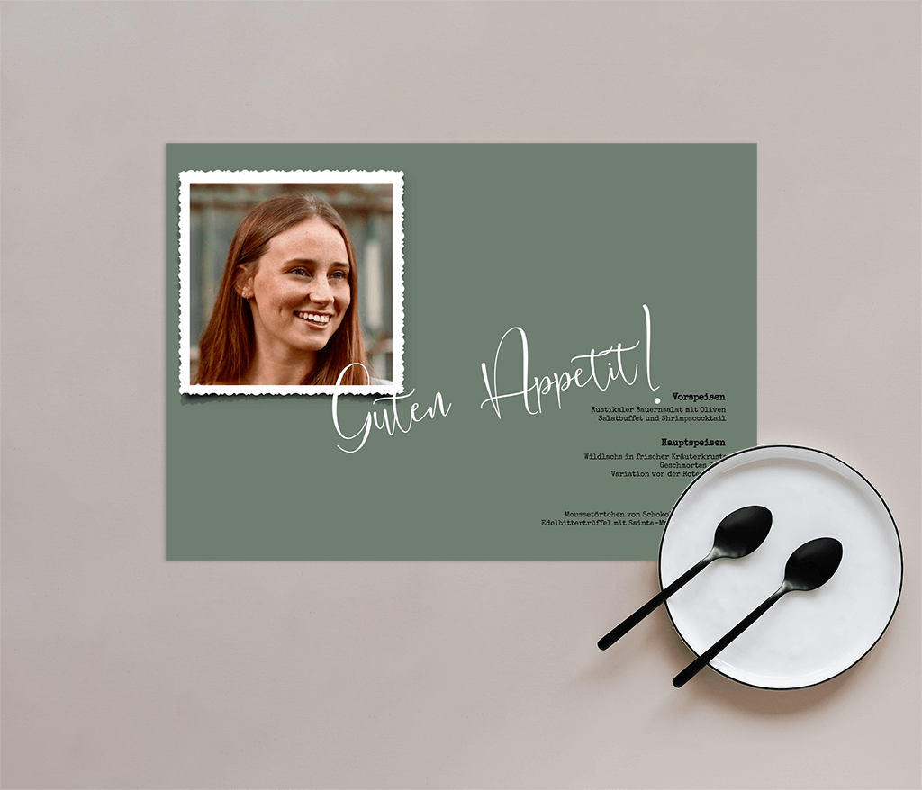 Tischset mit Foto und grüner Hintergrund zur Konfirmation