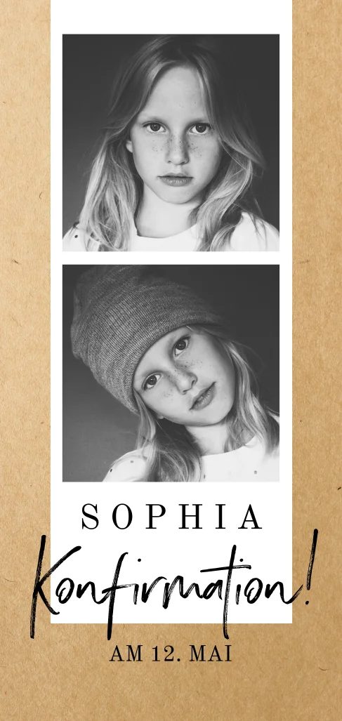 Schöne Konfirmationskarte mit einem Fotostreifen auf einem Kraftpapier-Look Hintergrund. Auf dieser Karte ist Platz für zwei Fotos. Die Texte können beliebig angepasst werden.Das Design der von dir gewählten Karte wurde automatisch in andere Formate umgestellt. Wähle einfach deinen Wunschformat aus und platziere alle Texte und Elemente an der richtigen Stelle im Editor. Du hast Fragen oder dein Favorit steht nicht zur Auswahl? Dann kontaktiere uns bitte und wir werden uns gemeinsam darum kümmern!