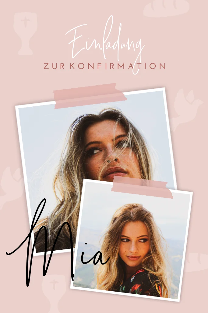 Eine schöne Einladungskarte zur Konfirmation, in rosa gehalten und mit zwei großen, eigenen Fotos. Auf dem rosa Hintergrund befinden sich verschiedene dezent weiße Symbole. Die Farbe kann nach Ihren Wünschen angepasst werden.