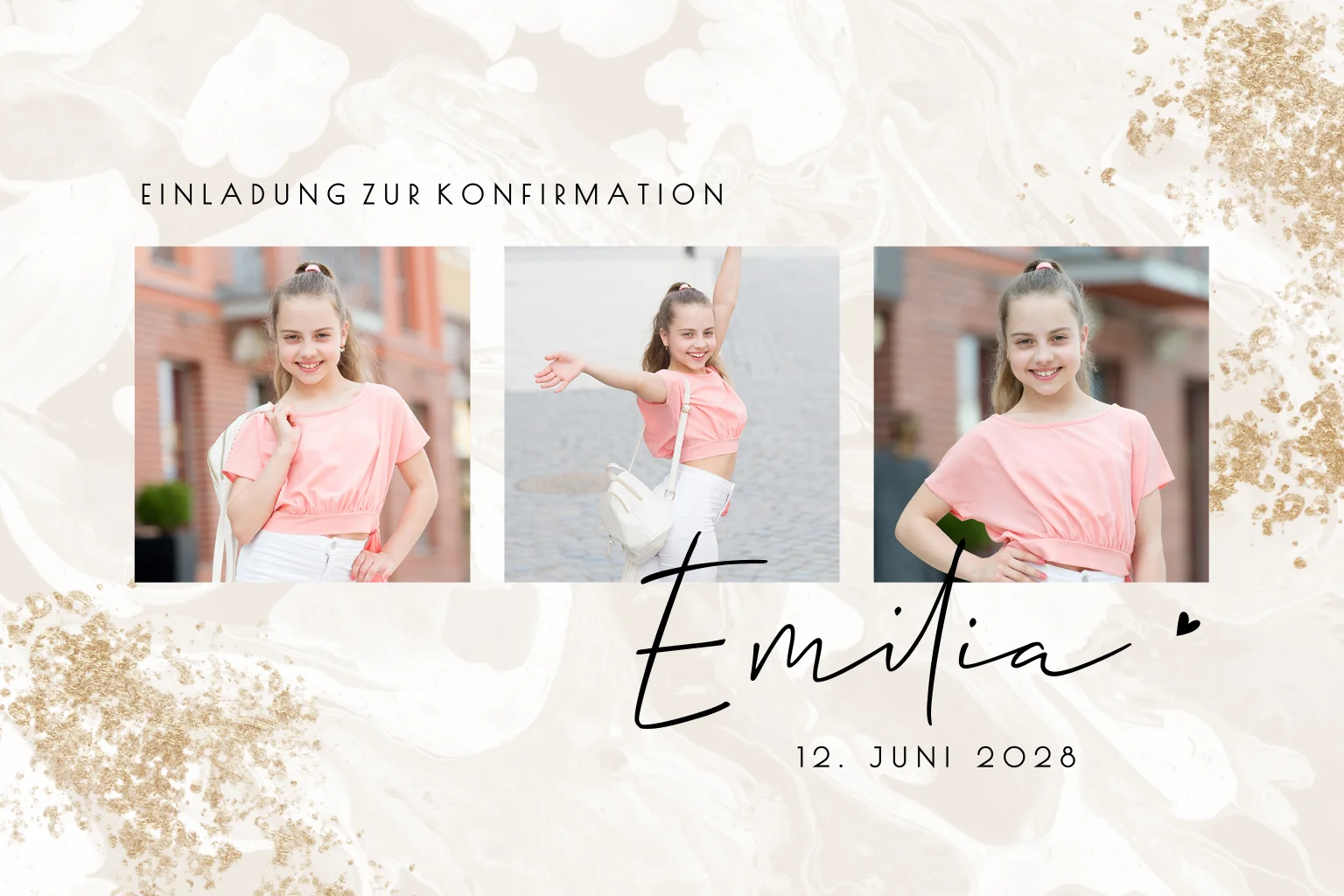 Verspielte Einladung zur Konfirmation mit Fotos und GoldspritzernDas Design der von dir gewählten Karte wurde automatisch in andere Formate umgestellt. Wähle einfach deinen Wunschformat aus und platziere alle Texte und Elemente an der richtigen Stelle im Editor. Du hast Fragen oder dein Favorit steht nicht zur Auswahl? Dann kontaktiere uns bitte und wir werden uns gemeinsam darum kümmern!