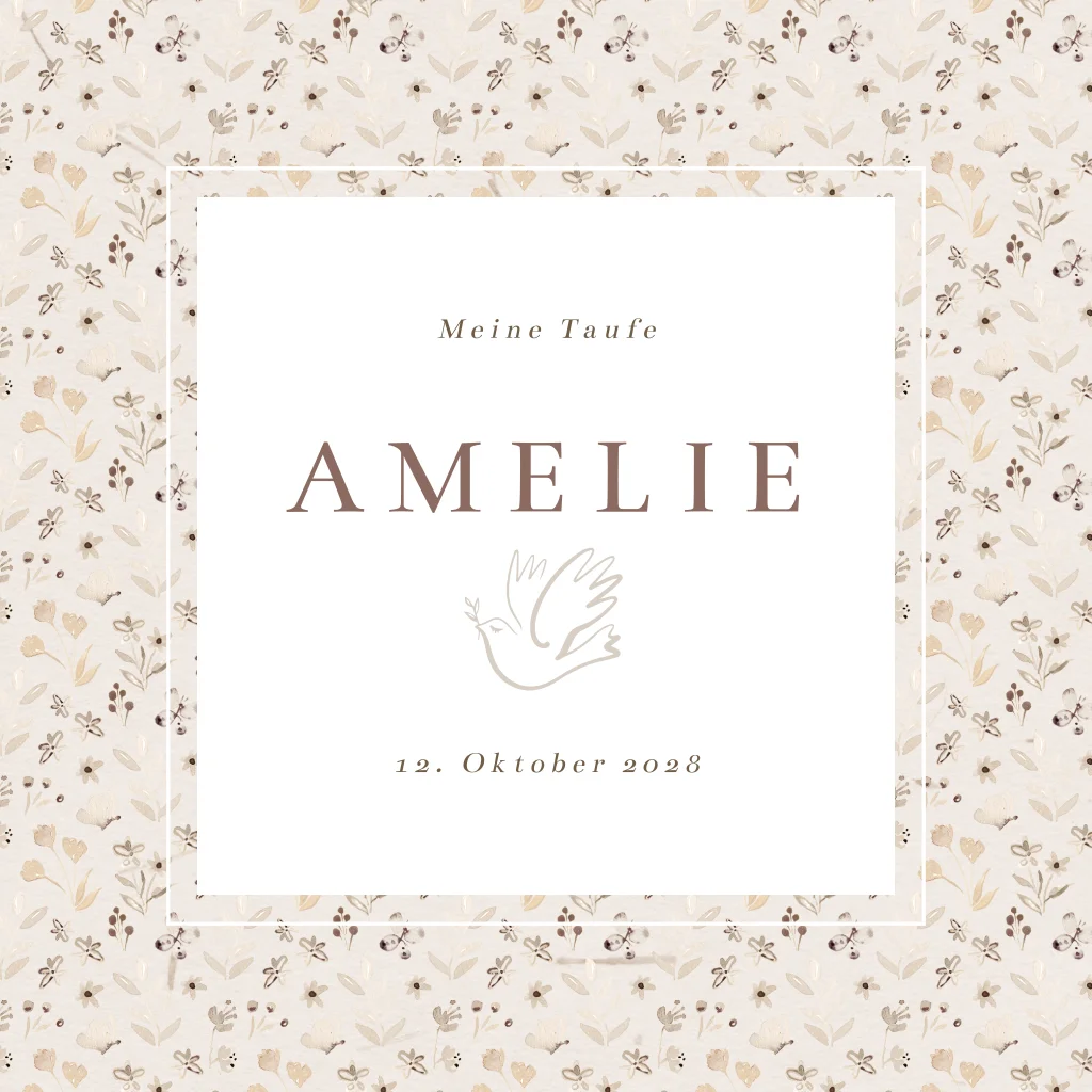 Einladung zur Taufe mit dezentem Blumenmuster in beige und Foto auf der Innenseite