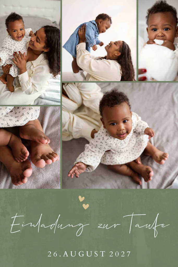 Einladung zur Taufe mit Fotocollage und Sage Hintergrund