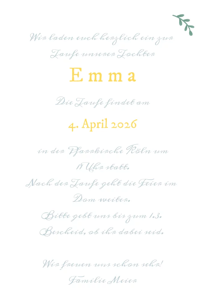 Das Design der von dir gewählten Karte wurde automatisch in andere Formate umgestellt. Wähle einfach deinen Wunschformat aus und platziere alle Texte und Elemente an der richtigen Stelle im Editor. Du hast Fragen oder dein Favorit steht nicht zur Auswahl? Dann kontaktiere uns bitte und wir werden uns gemeinsam darum kümmern!
