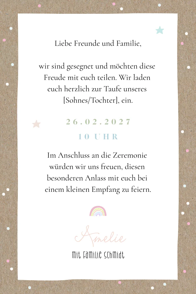 Erstelle mit wenigen Klicks ganz persönliche Einladungskarten für doe Taufe. Wo unsere Fantasie aufhört, fängt deine erst an! Du kannst deine auserwählte Einladungskarte nach Lust und Laune Maßschneidern: Wähle nicht nur dein bevorzugtes Kartenformat und deine Lieblingsfarben, sondern ergänze die Einladung zur Kommunion, Konfirmation, Taufe, Firmung oder Jugendweihe am Besten auch mit eigenen Bildern, Fotos und Texten! Karten auf Vintage Kraftpapier bestechen durch einen hippen Designkarton im rustic Kraftpapier-Look und sind mit modernen Schriftzügen bestückt absolut im Trend.