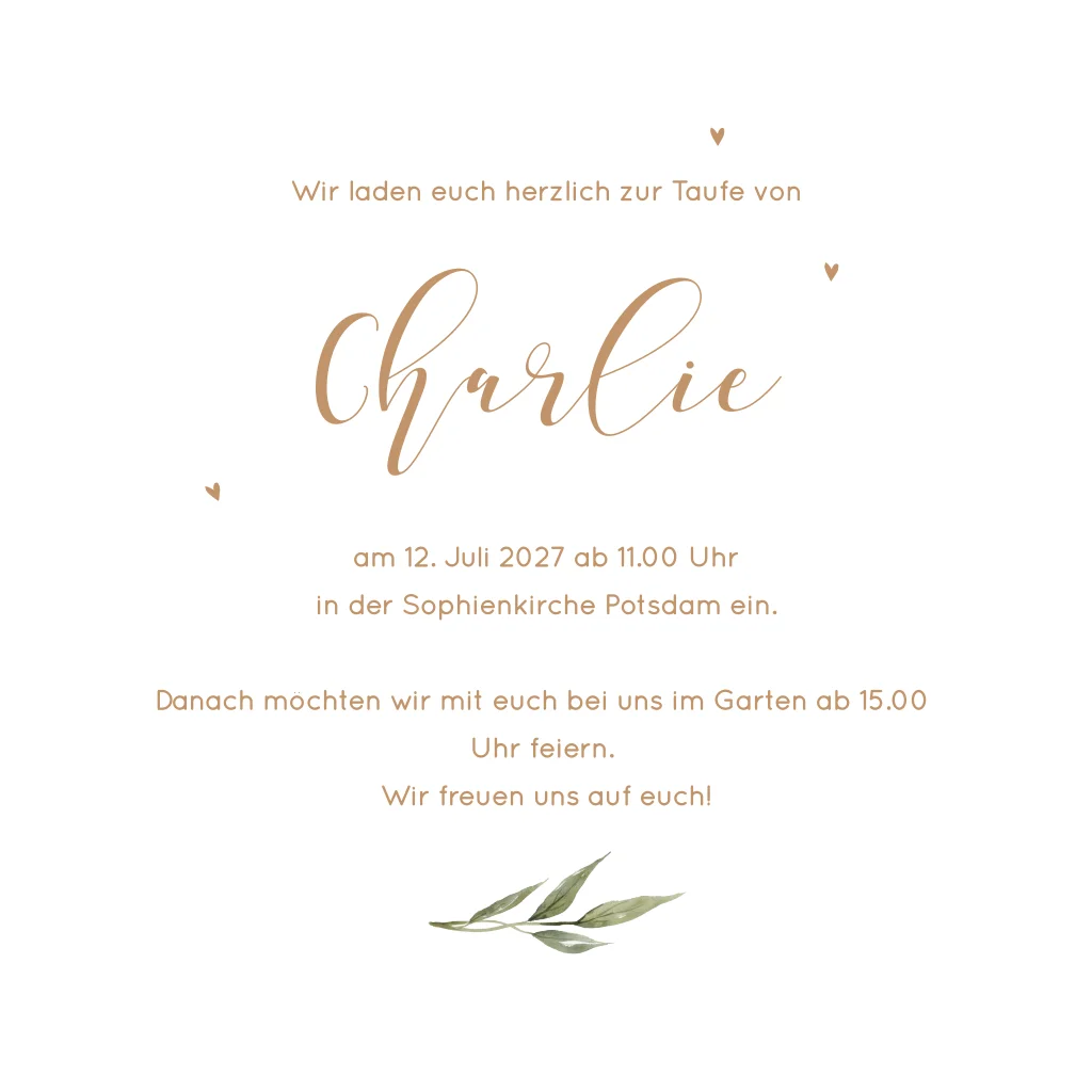 Das Design der von dir gewählten Karte wurde automatisch in andere Formate umgestellt. Wähle einfach deinen Wunschformat aus und platziere alle Texte und Elemente an der richtigen Stelle im Editor. Du hast Fragen oder dein Favorit steht nicht zur Auswahl? Dann kontaktiere uns bitte und wir werden uns gemeinsam darum kümmern!