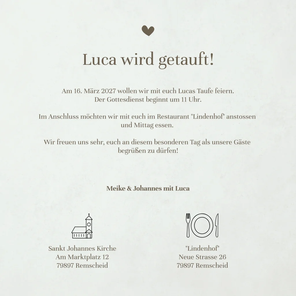 Das Design der von dir gewählten Karte wurde automatisch in andere Formate umgestellt. Wähle einfach deinen Wunschformat aus und platziere alle Texte und Elemente an der richtigen Stelle im Editor. Du hast Fragen oder dein Favorit steht nicht zur Auswahl? Dann kontaktiere uns bitte und wir werden uns gemeinsam darum kümmern!