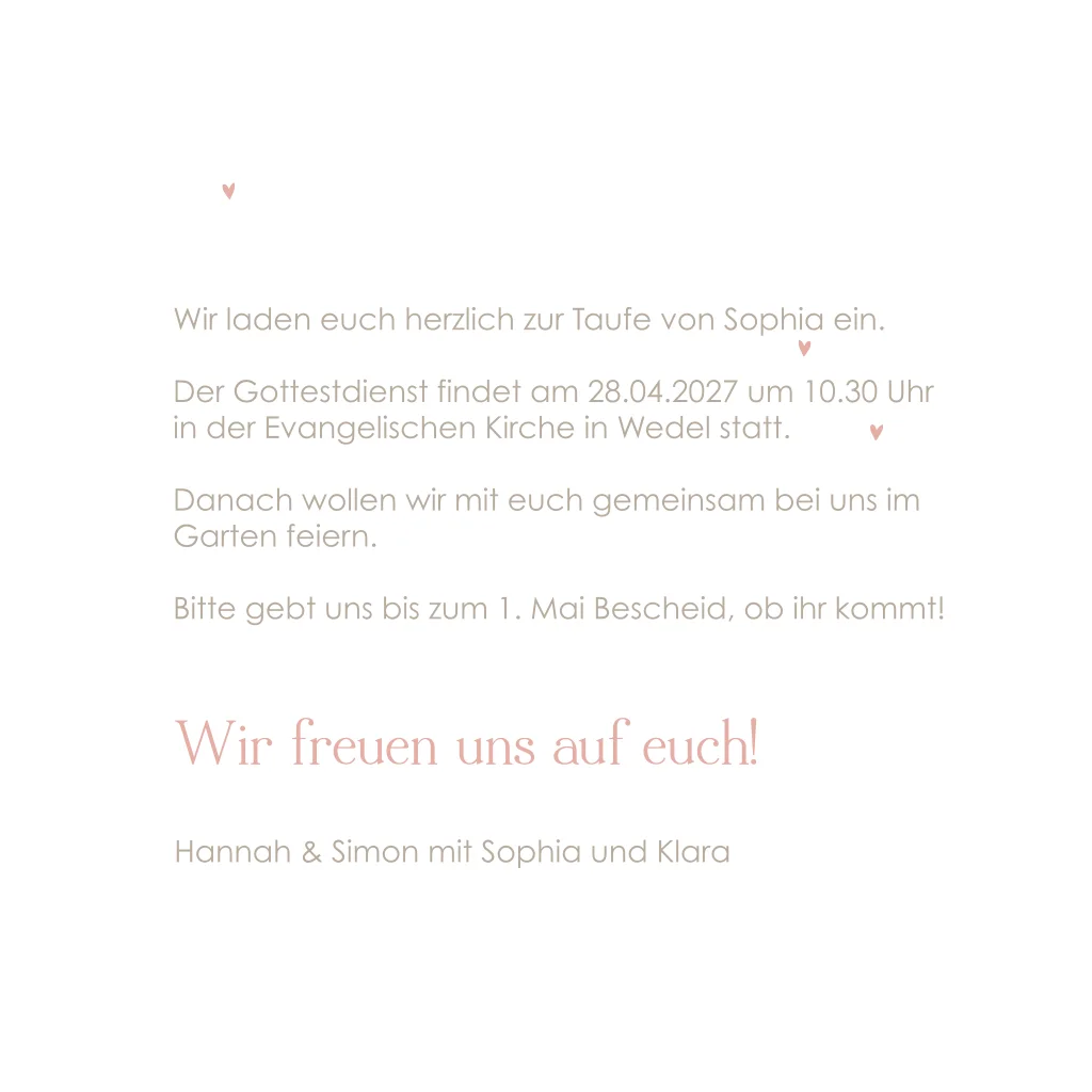 Das Design der von dir gewählten Karte wurde automatisch in andere Formate umgestellt. Wähle einfach deinen Wunschformat aus und platziere alle Texte und Elemente an der richtigen Stelle im Editor. Du hast Fragen oder dein Favorit steht nicht zur Auswahl? Dann kontaktiere uns bitte und wir werden uns gemeinsam darum kümmern!