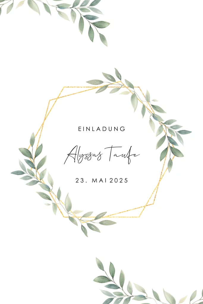 Elegante Einladung zur Taufe mit Zweigen und Blättern und goldenem Kreuz