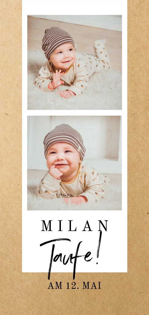 Diese elegante Einladung zur Taufe zeigt zwei Bilder des Täuflings im Polariod-Look.Melde dich für unseren Newsletter an und profitiere von exklusiven Angeboten, kreativen Ideen und Neuigkeiten aus unserer Produktwelt. Als Dankeschön für deine Anmeldung schenken wir dir einen kostenlosen Probedruck deiner Karte.