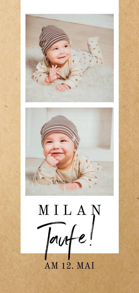 Diese elegante Einladung zur Taufe zeigt zwei Bilder des Täuflings im Polariod-Look.Das Design der von dir gewählten Karte wurde automatisch in andere Formate umgestellt. Wähle einfach deinen Wunschformat aus und platziere alle Texte und Elemente an der richtigen Stelle im Editor. Du hast Fragen oder dein Favorit steht nicht zur Auswahl? Dann kontaktiere uns bitte und wir werden uns gemeinsam darum kümmern!