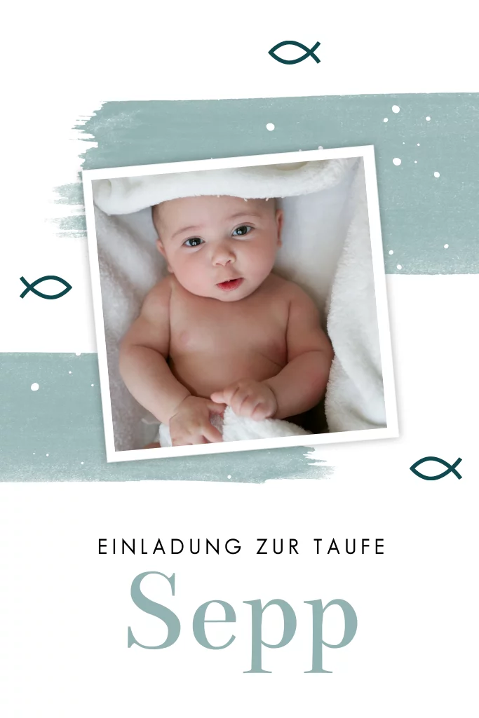 Diese moderne Einladung zur Taufe zeigt das Foto des Täuflings in der Mitte. Im Hintergrund sind Fische und blaue Farbstreifen zu sehen.Melde dich für unseren Newsletter an und profitiere von exklusiven Angeboten, kreativen Ideen und Neuigkeiten aus unserer Produktwelt. Als Dankeschön für deine Anmeldung schenken wir dir einen kostenlosen Probedruck deiner Karte.